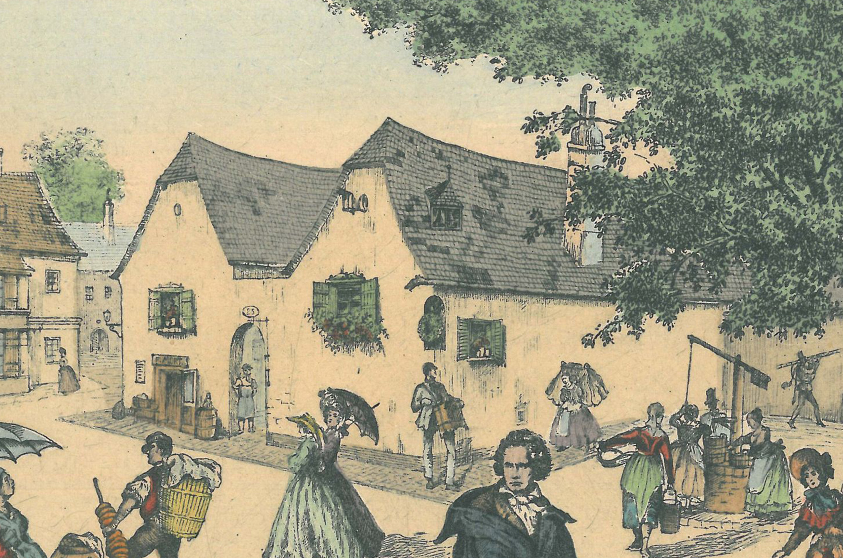Für Ludwig van Beethoven (1770-1827) waren die Aufenthalte in Heiligenstadt, damals noch ländlicher Wiener Vorort, von tiefen Gefühlen geprägt. Er litt unter einem Gehörleiden und erhoffte sich vom Besuch der Kuranstalt in Heiligenstadt, in unmittelbarer Nähe zum Mayer am Pfarrplatz gelegen, Besserung. Bereits 1802 hatte Beethoven im „Heiligenstädter Testament“ seine Verzweiflung wegen seiner Schwerhörigkeit in erschütterten Worten dokumentiert.