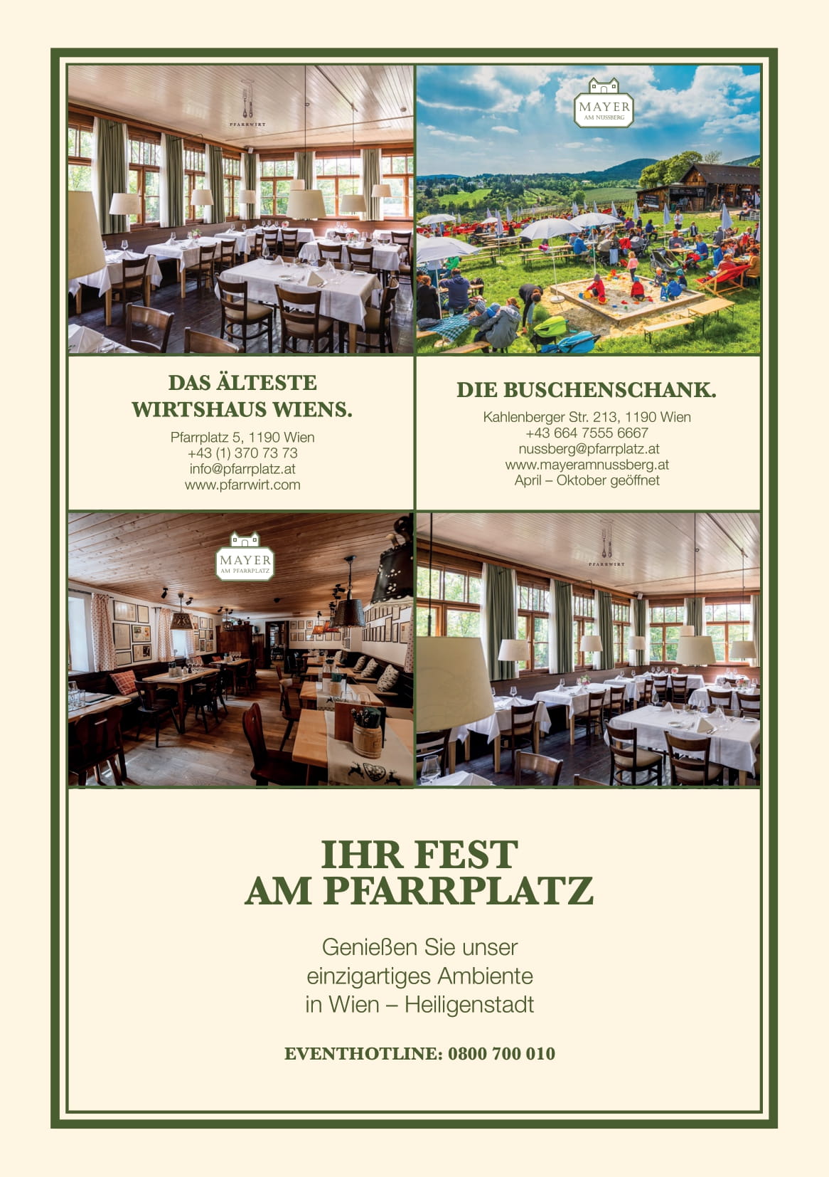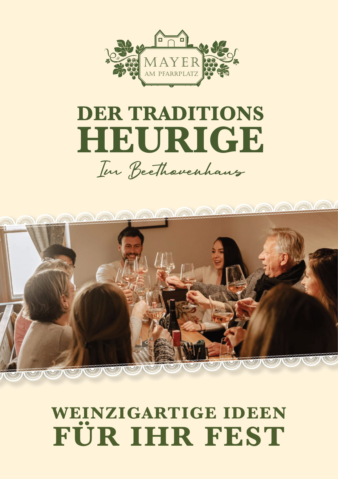 Ein einzigartiges Ambiente, die vielen Möglichkeiten in den denkmalgeschützten Stüberln, die köstlichen Schmankerl und der preisgekrönte Wein sind einige der Gründe, weshalb die Feiern beim Heurigen Mayer am Pfarrplatz zum unvergesslichen Erlebnis werden. Ob Hochzeiten, private Feiern jeglicher Art, Firmenfeiern oder Ihre Weihnachtsfeier – bei uns finden Sie bestimmt den passenden Rahmen für Ihren Anlass.