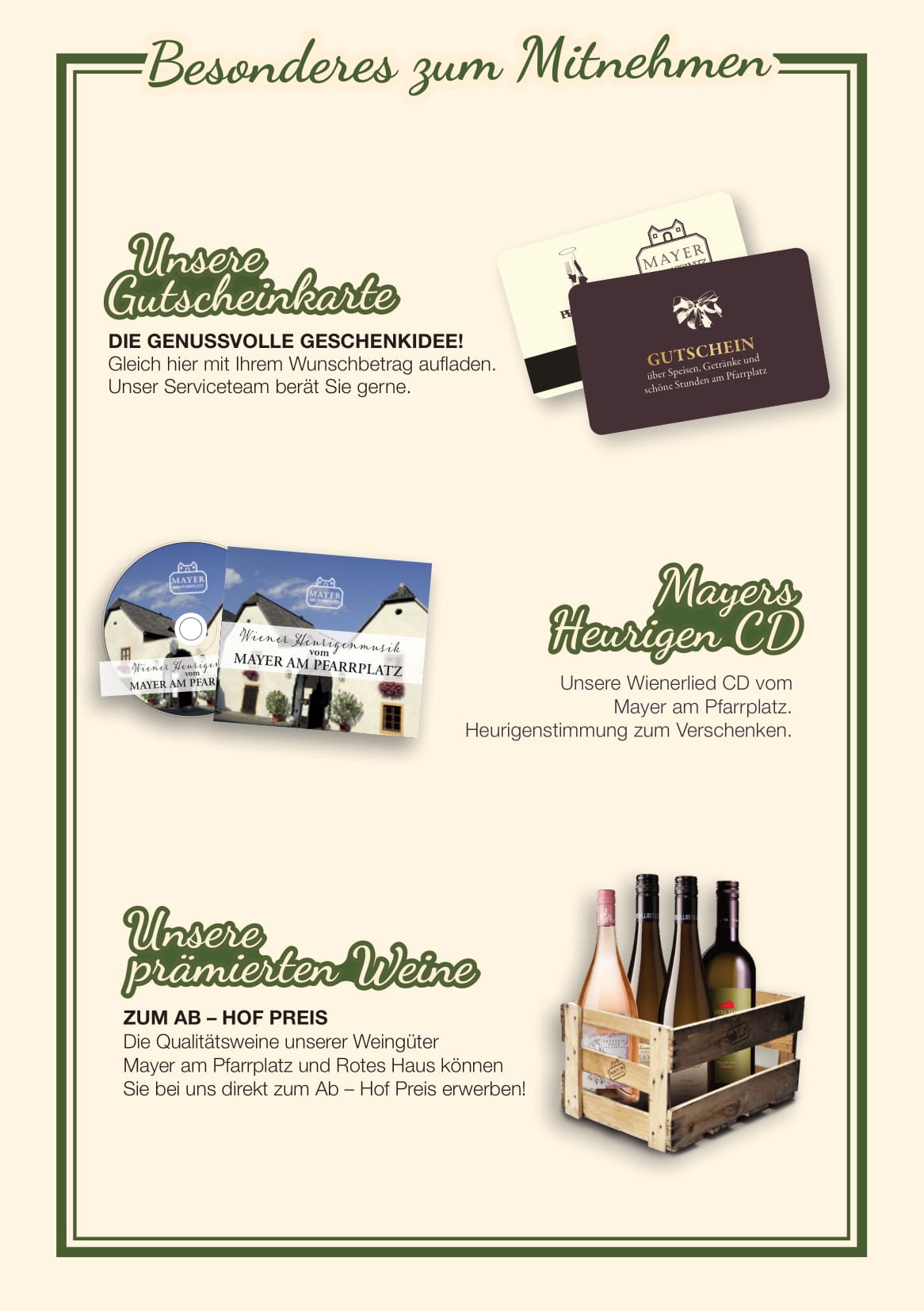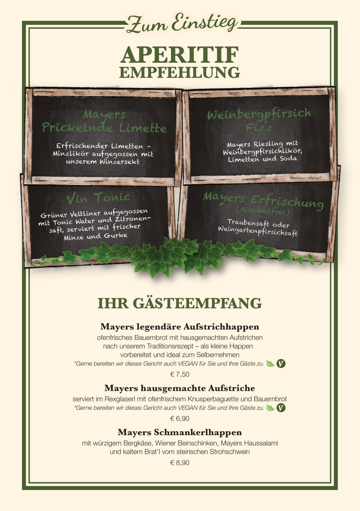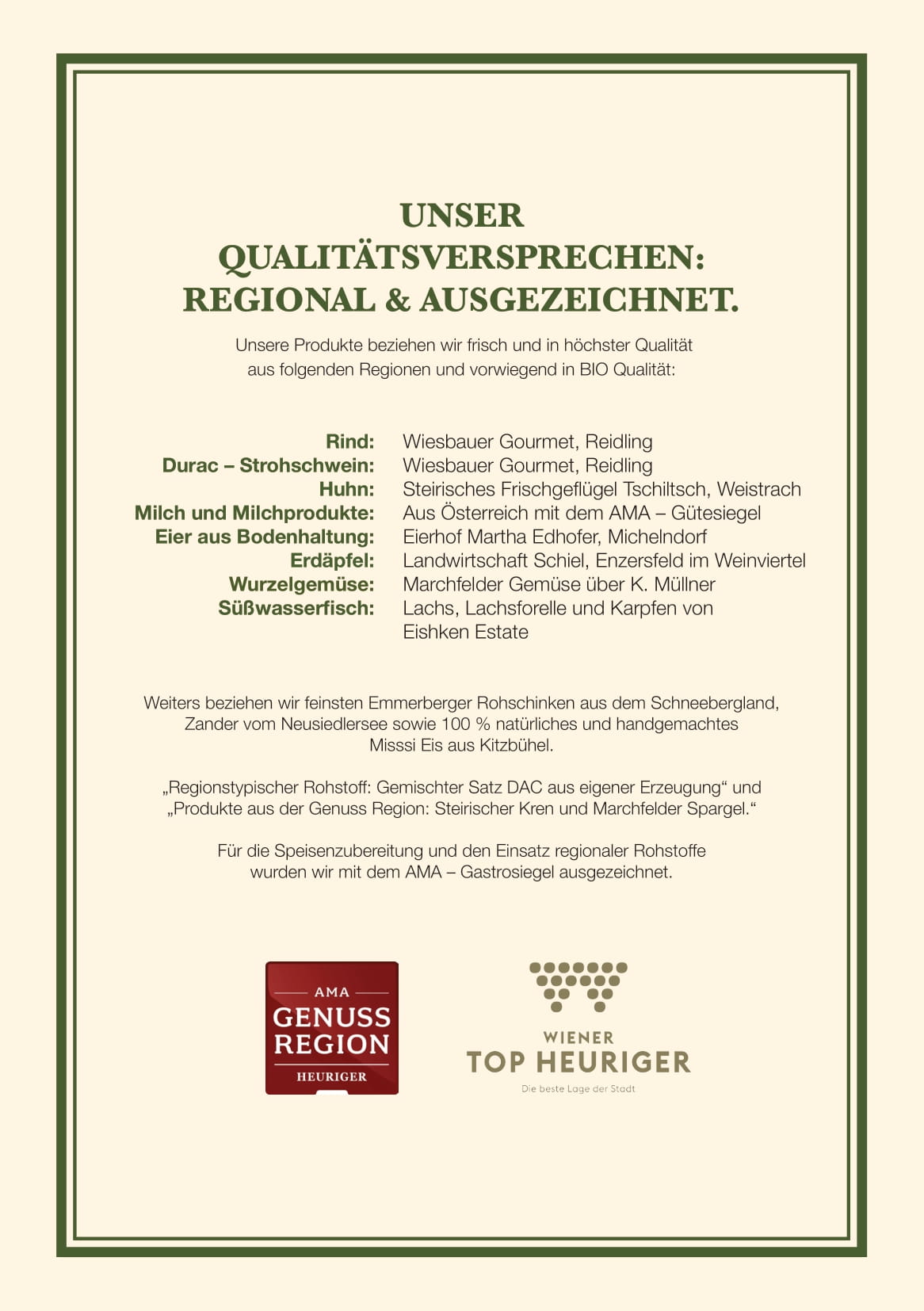 Qualität, die man schmeckt. Für unsere Schmankerl verwenden wir Produkte aus umliegenden Regionen bzw. aus Österreich. Dies erfreut nicht nur unsere Gäste sondern hat unserem Heurigen „Mayer am Pfarrplatz“ auch das AMA-Gastrosiegel eingebracht.