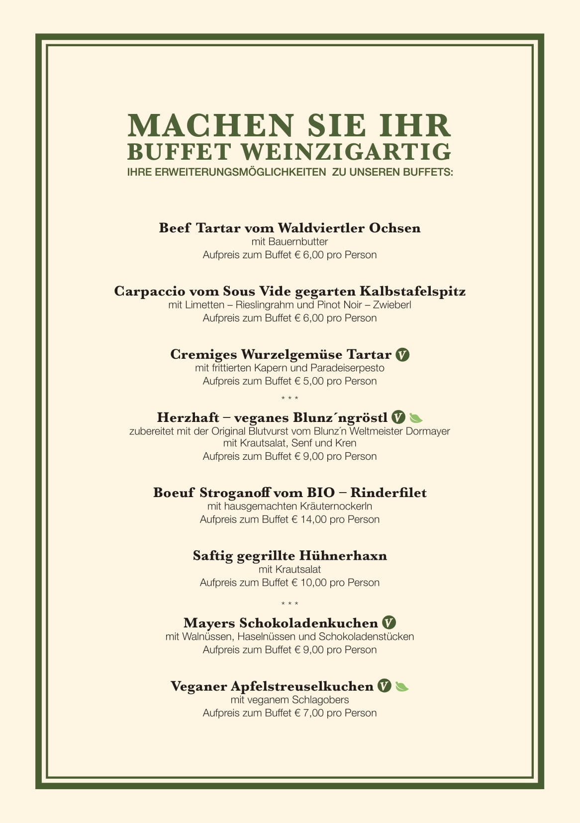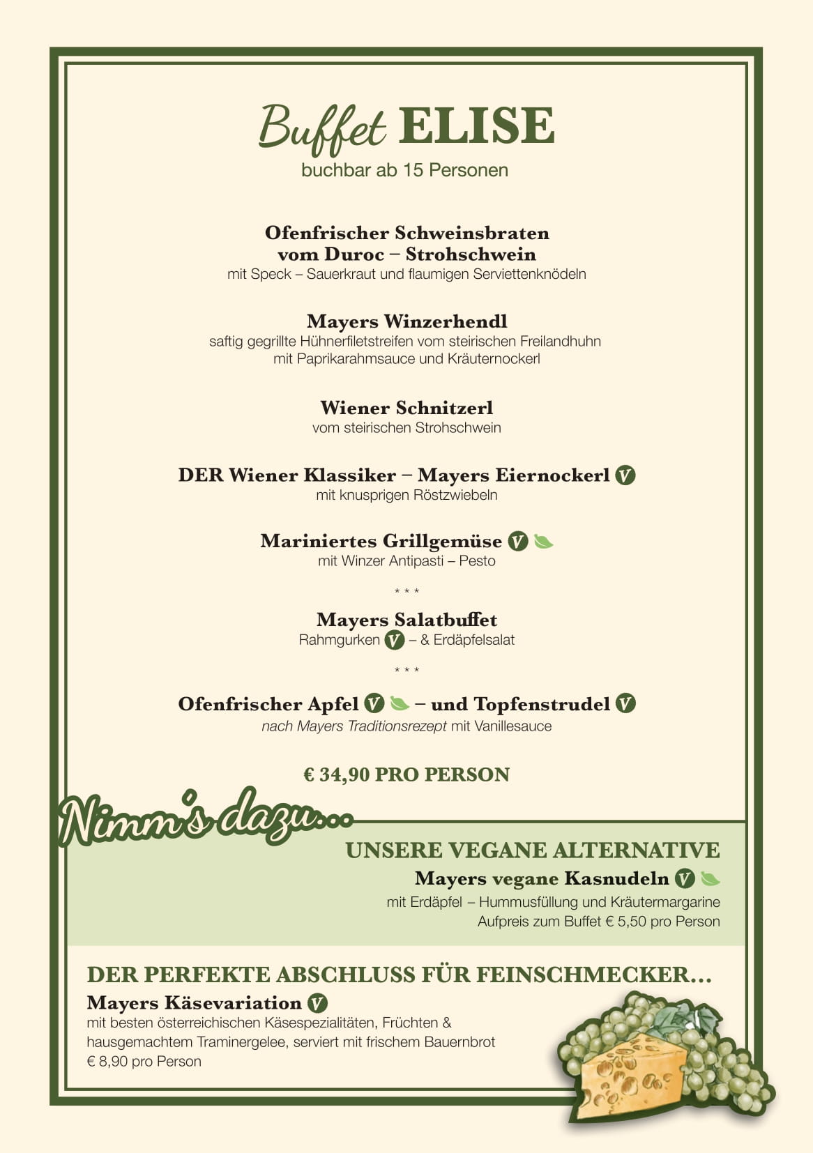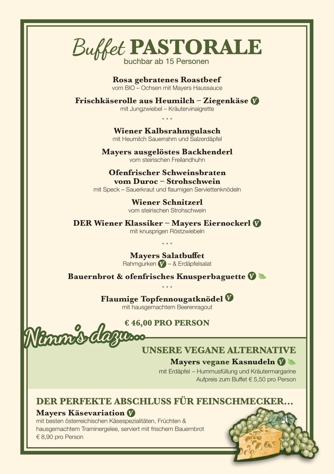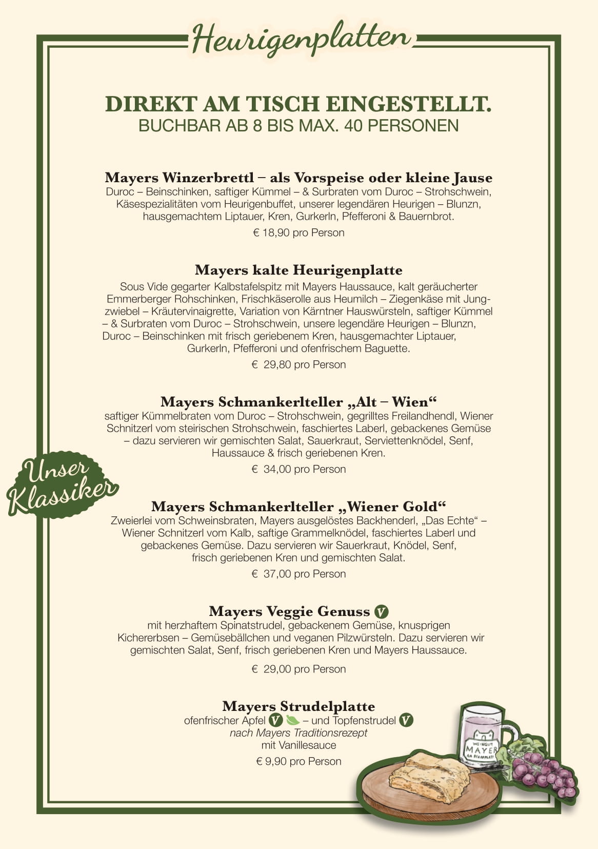 Unsere Stüberl in unterschiedlichen Größen ermöglichen Ihnen ein exklusives Fest schon ab 10 Personen und bei größeren Runden bietet Ihnen unser Heuriger Platz für bis zu 450 Personen. Wir kochen für Sie eines unserer vorgeschlagenen Buffets oder erarbeiten mit Ihnen ein Buffet ganz nach Ihren Vorstellungen. Unser Team vom Mayer am Pfarrplatz steht Ihnen für die Organisation Ihrer Veranstaltung stets zur Verfügung.