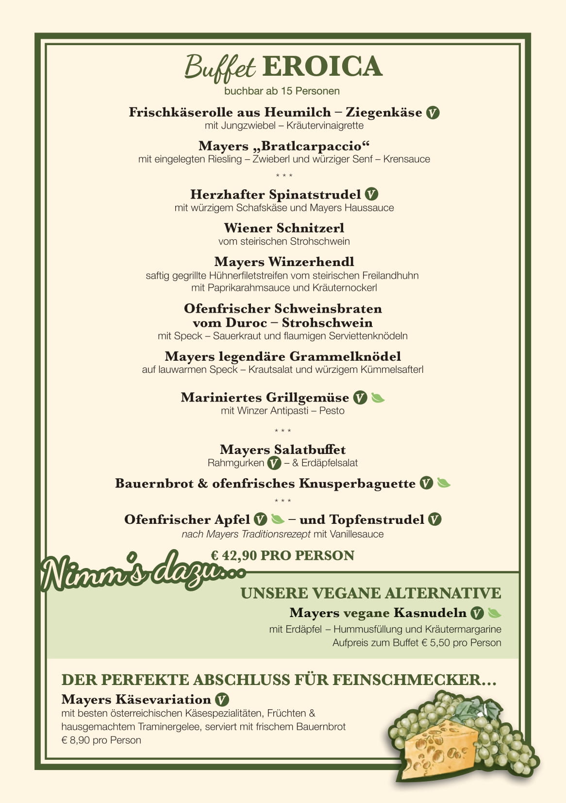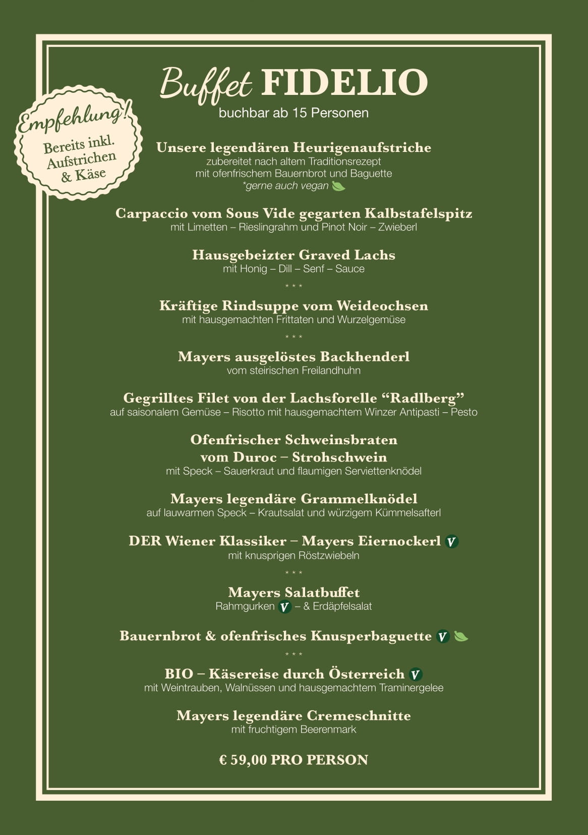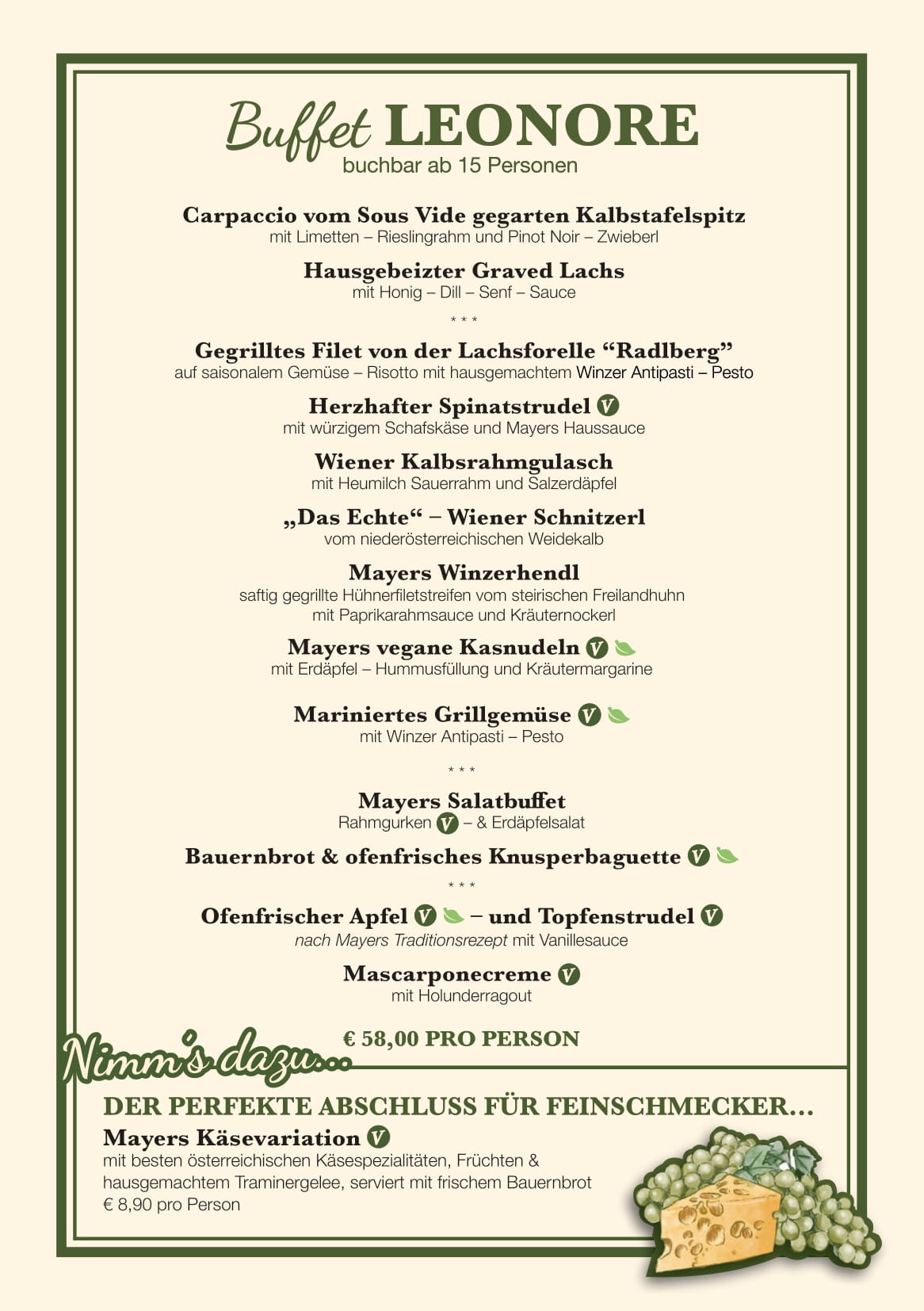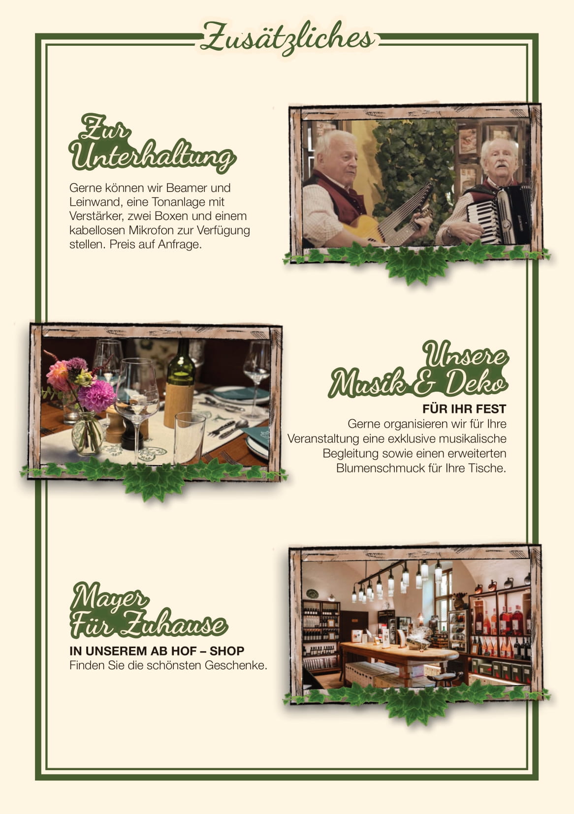 Unsere Stüberl in unterschiedlichen Größen ermöglichen Ihnen ein exklusives Fest schon ab 10 Personen und bei größeren Runden bietet Ihnen unser Heuriger Platz für bis zu 450 Personen. Wir kochen für Sie eines unserer vorgeschlagenen Buffets oder erarbeiten mit Ihnen ein Buffet ganz nach Ihren Vorstellungen. Unser Team vom Mayer am Pfarrplatz steht Ihnen für die Organisation Ihrer Veranstaltung stets zur Verfügung.